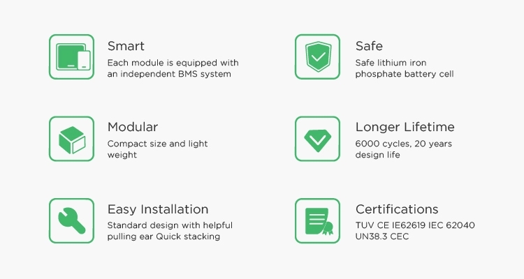 การรับรองและความปลอดภัย Stadard | TUV / CE / EN62619 / IEC62040 / UN38.3 / CEC ได้รับการรับรอง | |